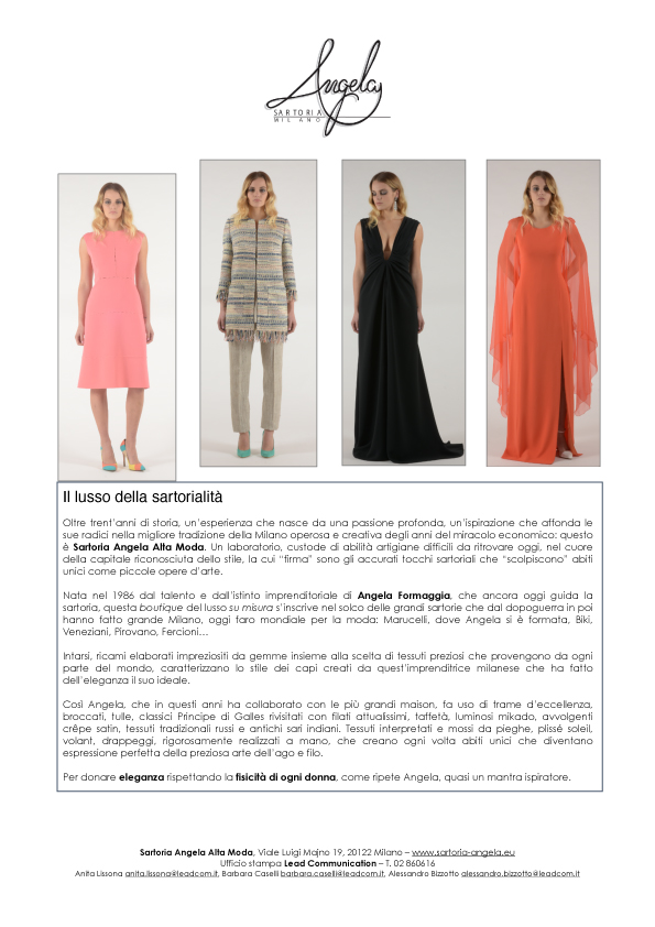La cura del dettaglio è un must. Ogni collezione di Sartoria Angela sa valorizzare la femminilità e andare incontro a qualsiasi esigenza, perché i desideri di ogni donna prendano forma esaltando la sua bellezza.